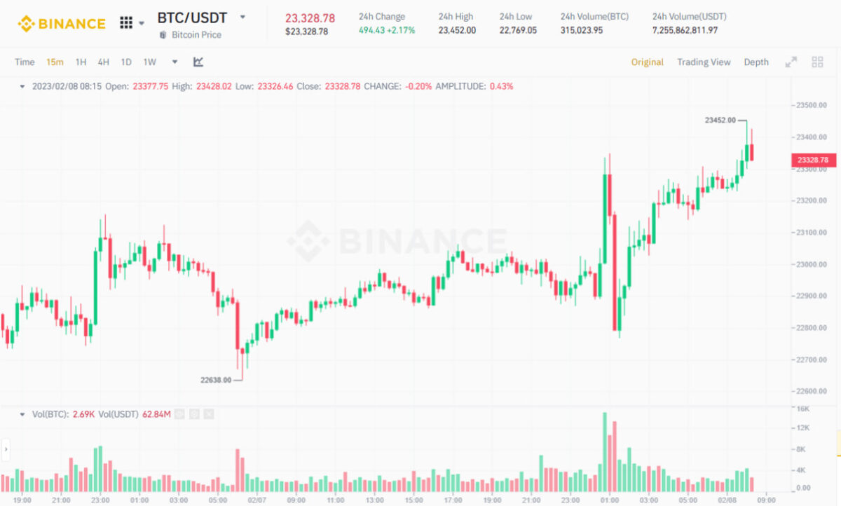 15m Chart of BTC/USDT on Binance at 08:25 AM on February 8, 2023