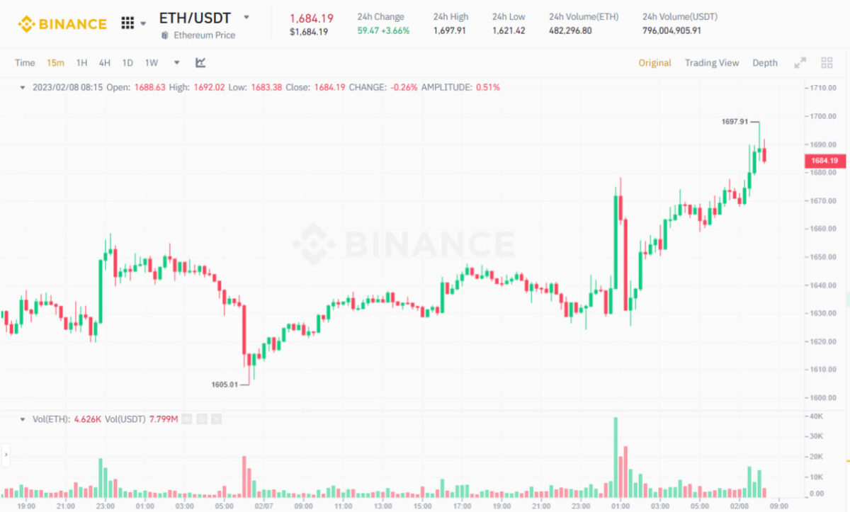 15m Chart of ETH/USDT on Binance at 08:25 AM on February 8, 2023