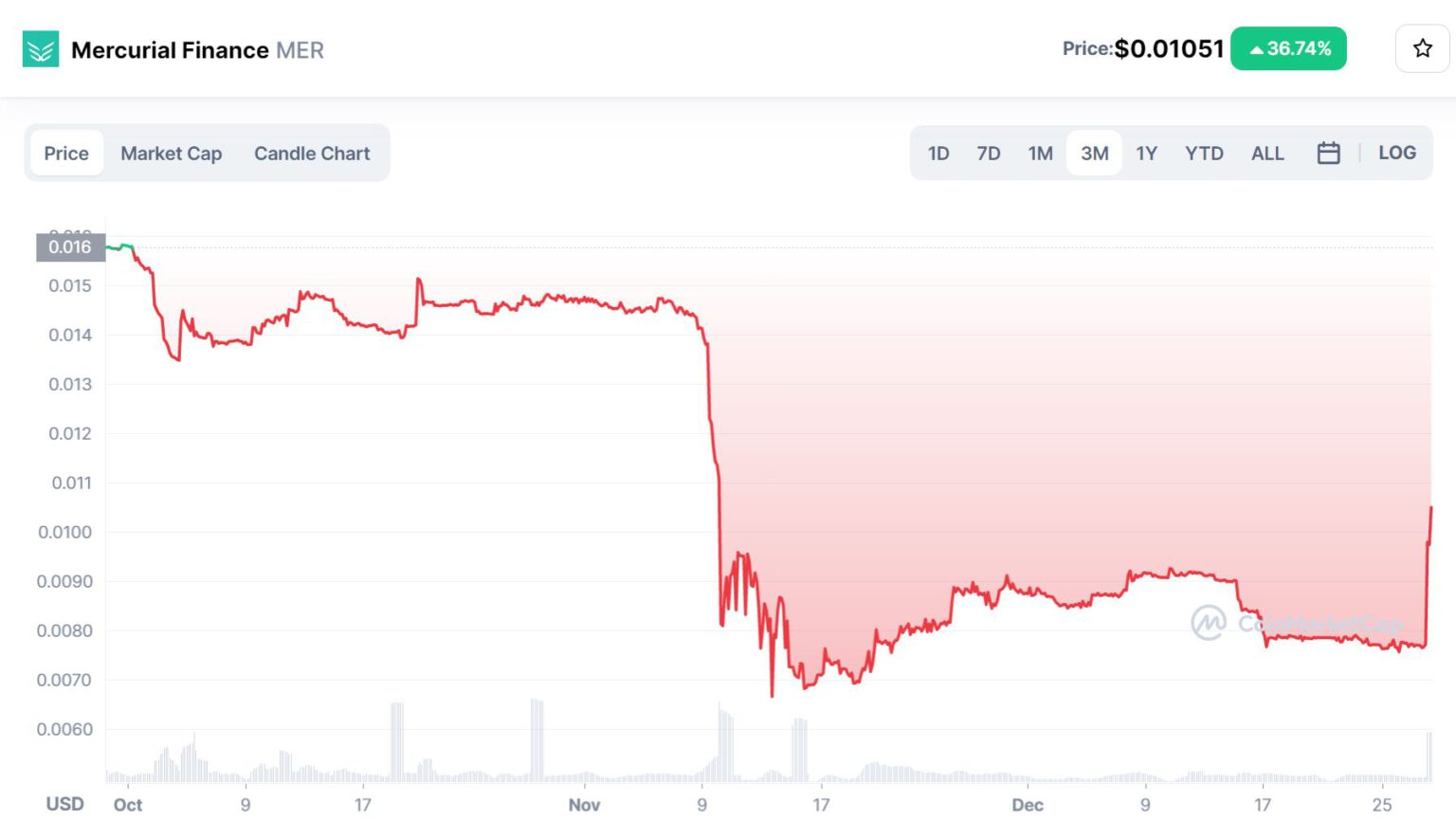Mercurial Finance (MER) price movement over the last 3 months, screenshot from CoinMarketCap as of December 28, 2022
