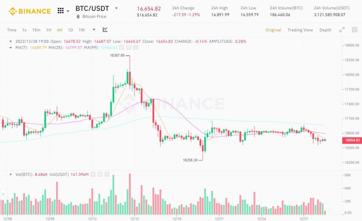 4-hour chart of BTC/USDT on Binance as of 08:25 PM on December 28, 2022