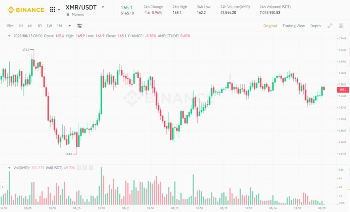 1-hour chart of XMR/USDT on Binance as of 08:50 AM, August 15, 2022
