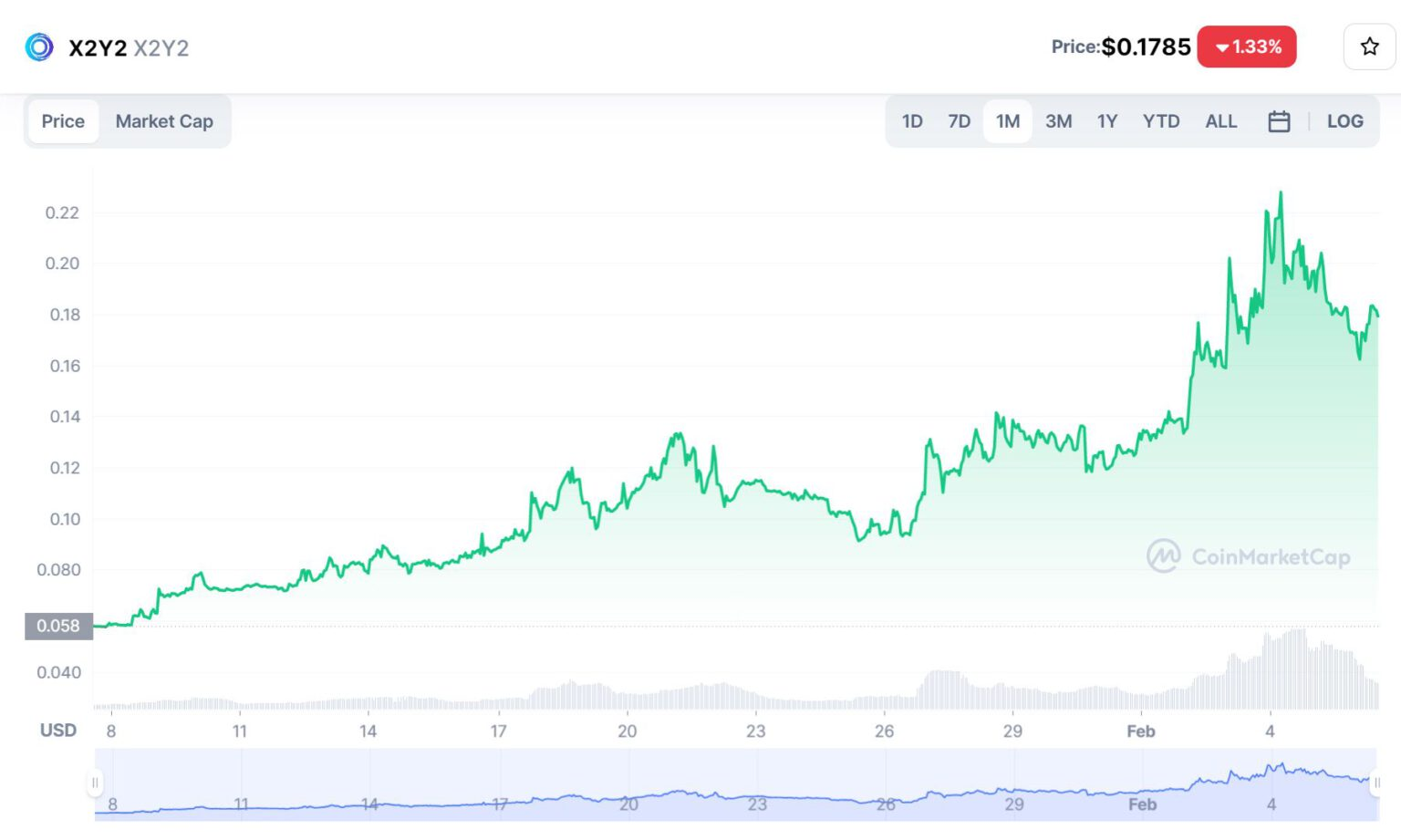 X2Y2 Price Movement in the Last Month, screenshot from CoinMarketCap as of 12:20 PM on February 6, 2023