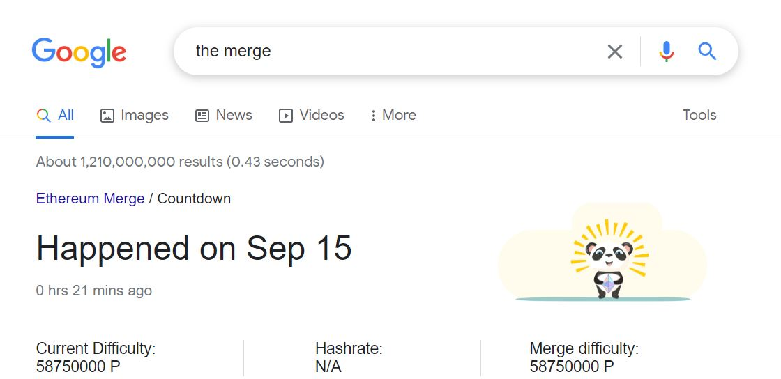 Google’s Merge countdown clock also celebrated the event with the merging of two bears—black and white—into a panda, the mascot of The Merge.
