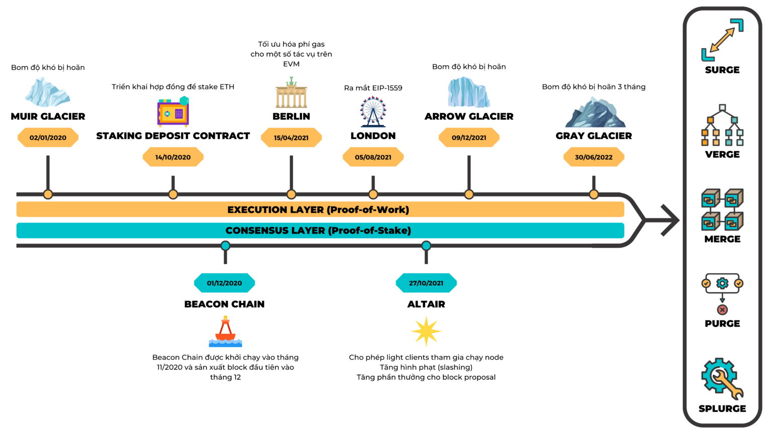 However, gas fees on Ethereum will not decrease, and transaction speeds will not improve post-Merge. Improvements in gas fees and transaction speeds will depend on sharding, which is being implemented as part of The Surge—a crucial update happening alongside The Merge. Other updates such as The Verge, The Purge, and The Splurge are also being developed by the Ethereum team to make the blockchain faster, more decentralized, and more accessible to the public