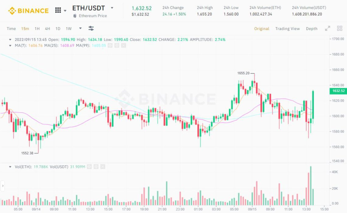 ETH price on Binance’s ETH/USDT 15-minute chart at 01:48 PM on 15/09/2022
