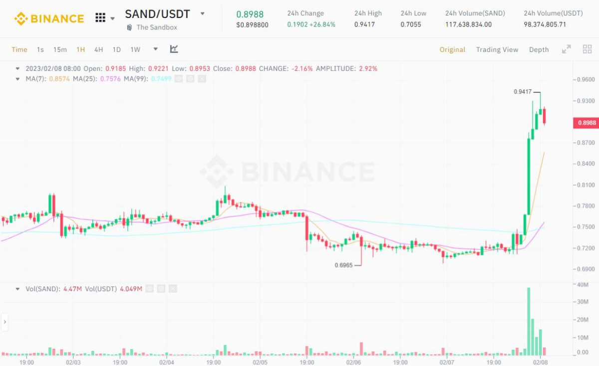 1h Chart of SAND/USDT on Binance at 08:25 AM on February 8, 2023