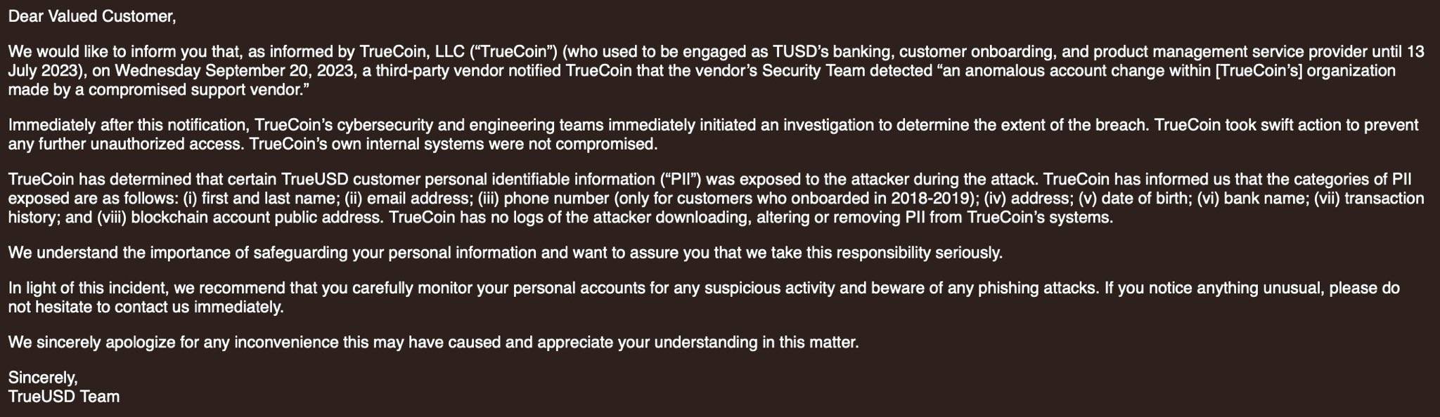 The email further stated that immediately upon notification, TrueCoin's cybersecurity and technical teams investigated to determine the extent of the breach and advised customers to closely monitor their personal accounts and report any suspicious activity.