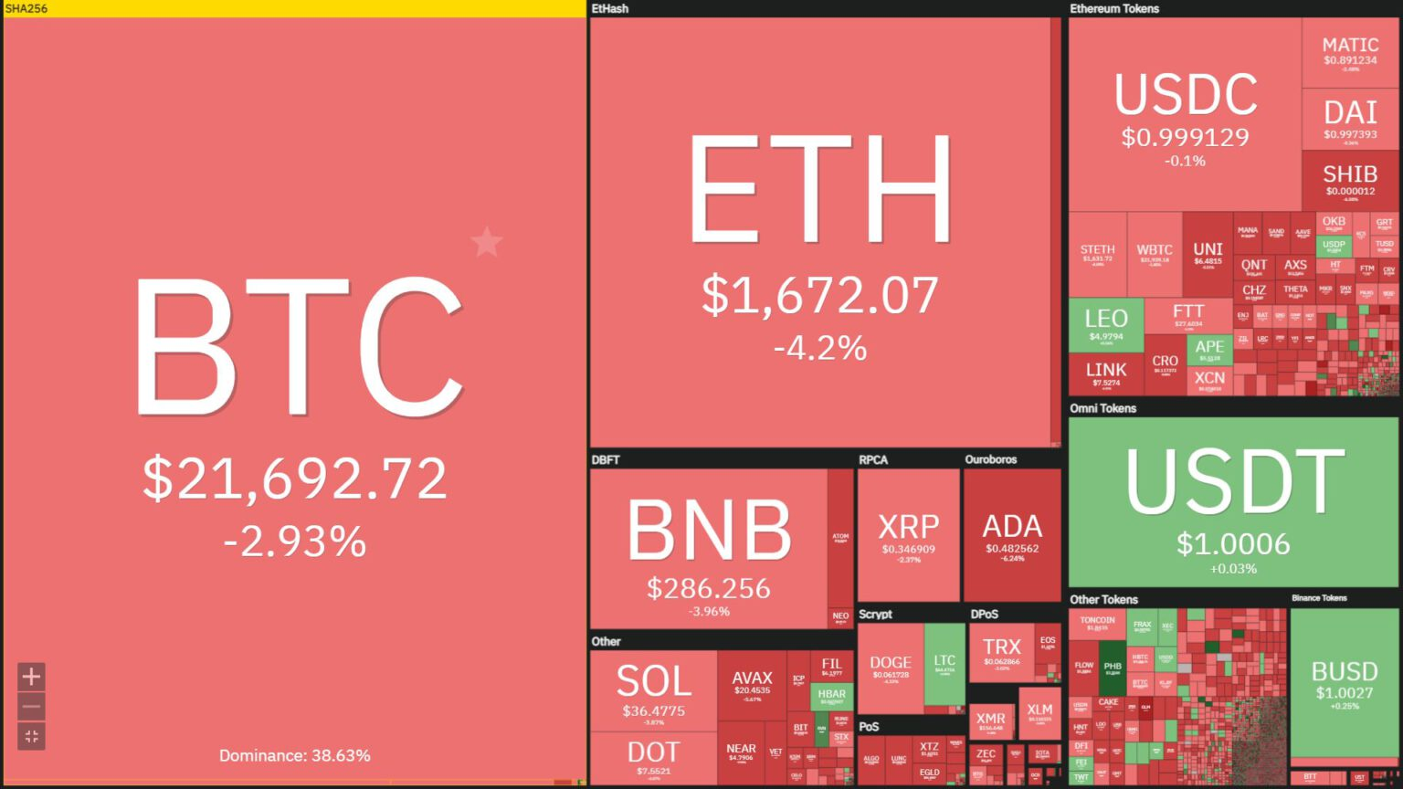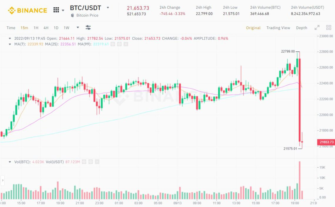 Bitcoin is currently trading at $21,900, having dropped sharply from around $22,800 just minutes before the CPI data was released. The price briefly touched $21,600, and selling pressure shows no signs of abating.