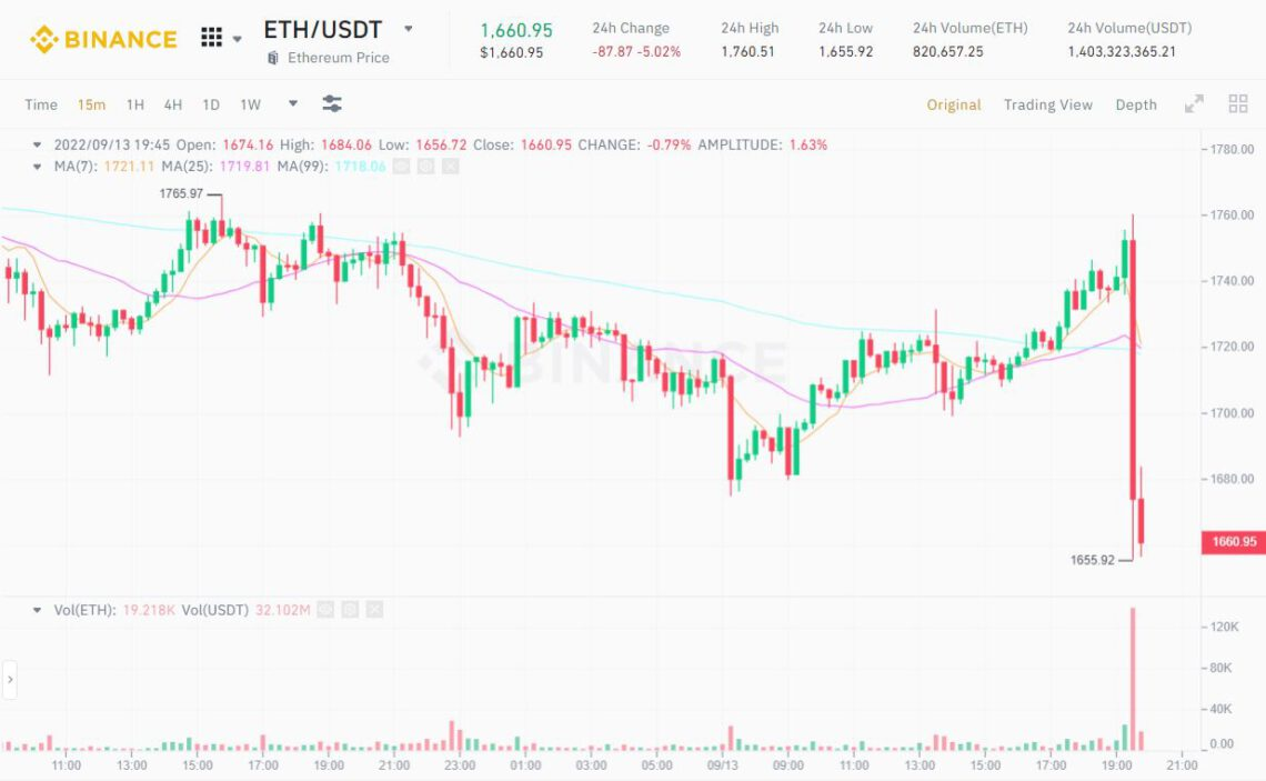 1-Hour Chart of ETH/USDT on Binance at 07:50 PM on 13/09/2022