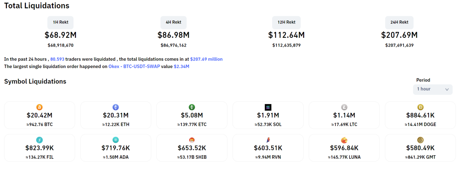 Value of Liquidated Cryptocurrencies in the Past Hour, Data from Coinglass at 07:50 PM on 13/09/2022