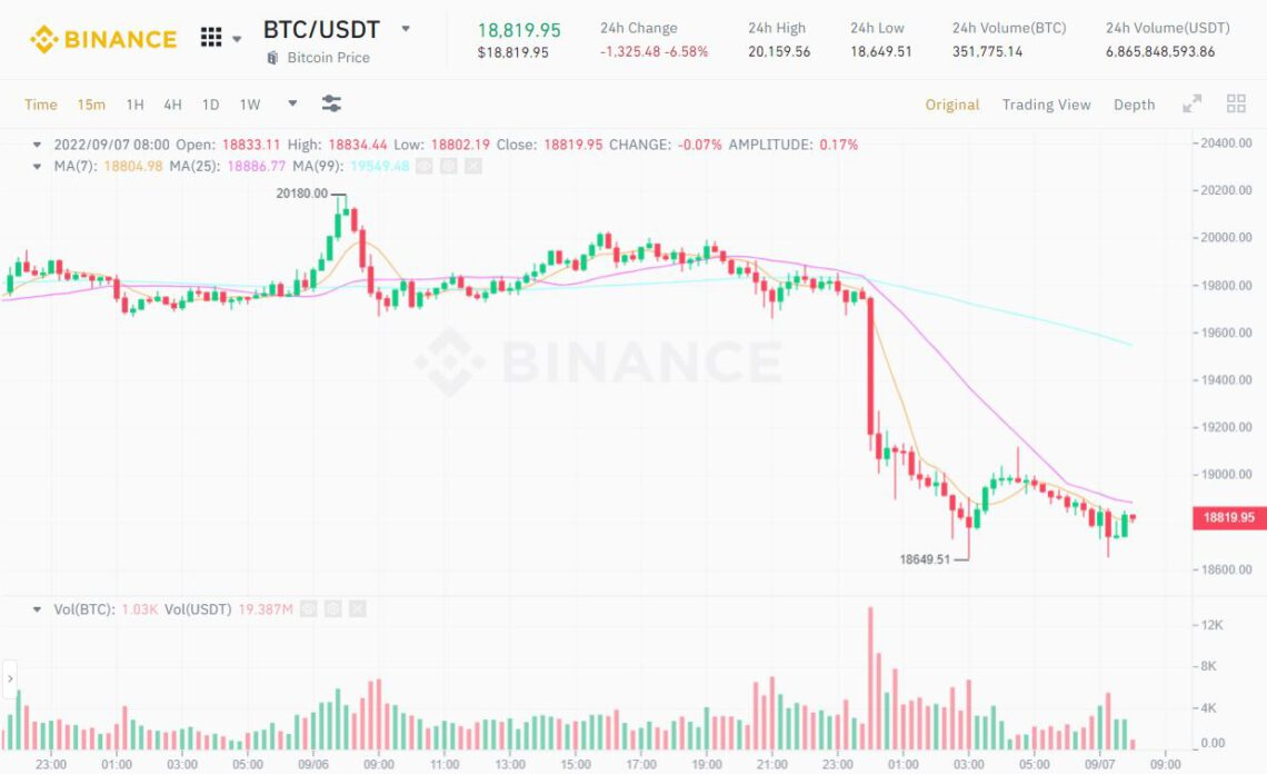 Around midnight on September 7, Bitcoin (BTC), the world’s largest cryptocurrency, saw a sharp sell-off, falling from $19,700 to $19,175. In the following hours, BTC continued to decline, reaching a low of $18,649 — its lowest point since June 30.