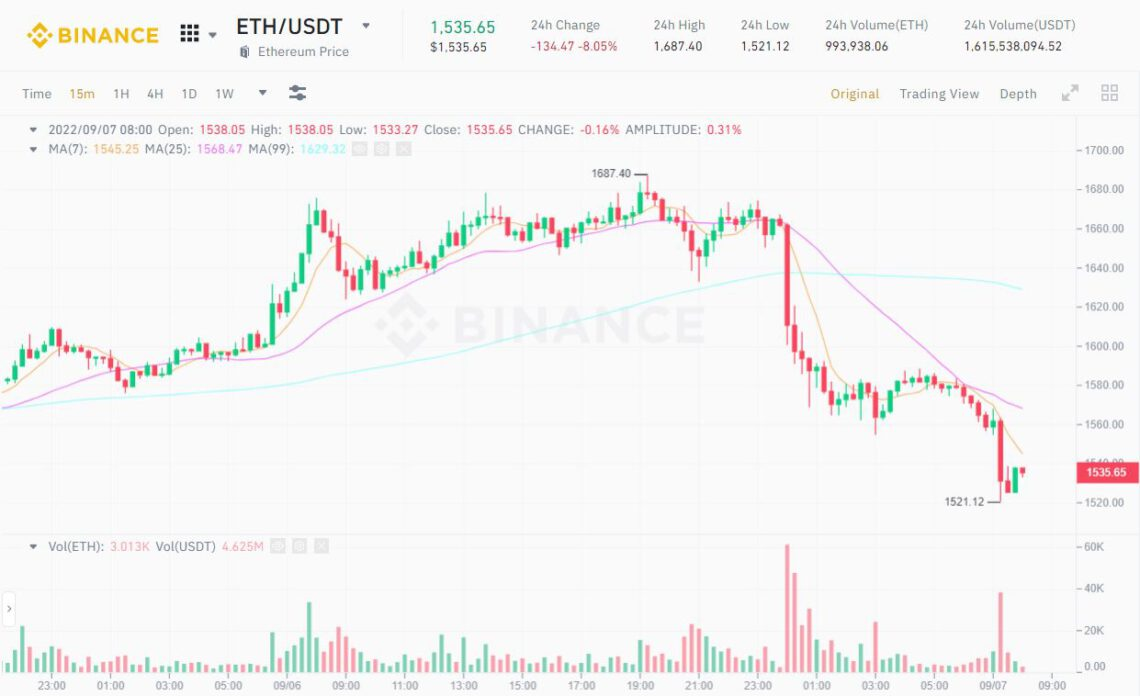 ETH/USDT 15m Chart on Binance as of 08:05 AM September 7, 2022