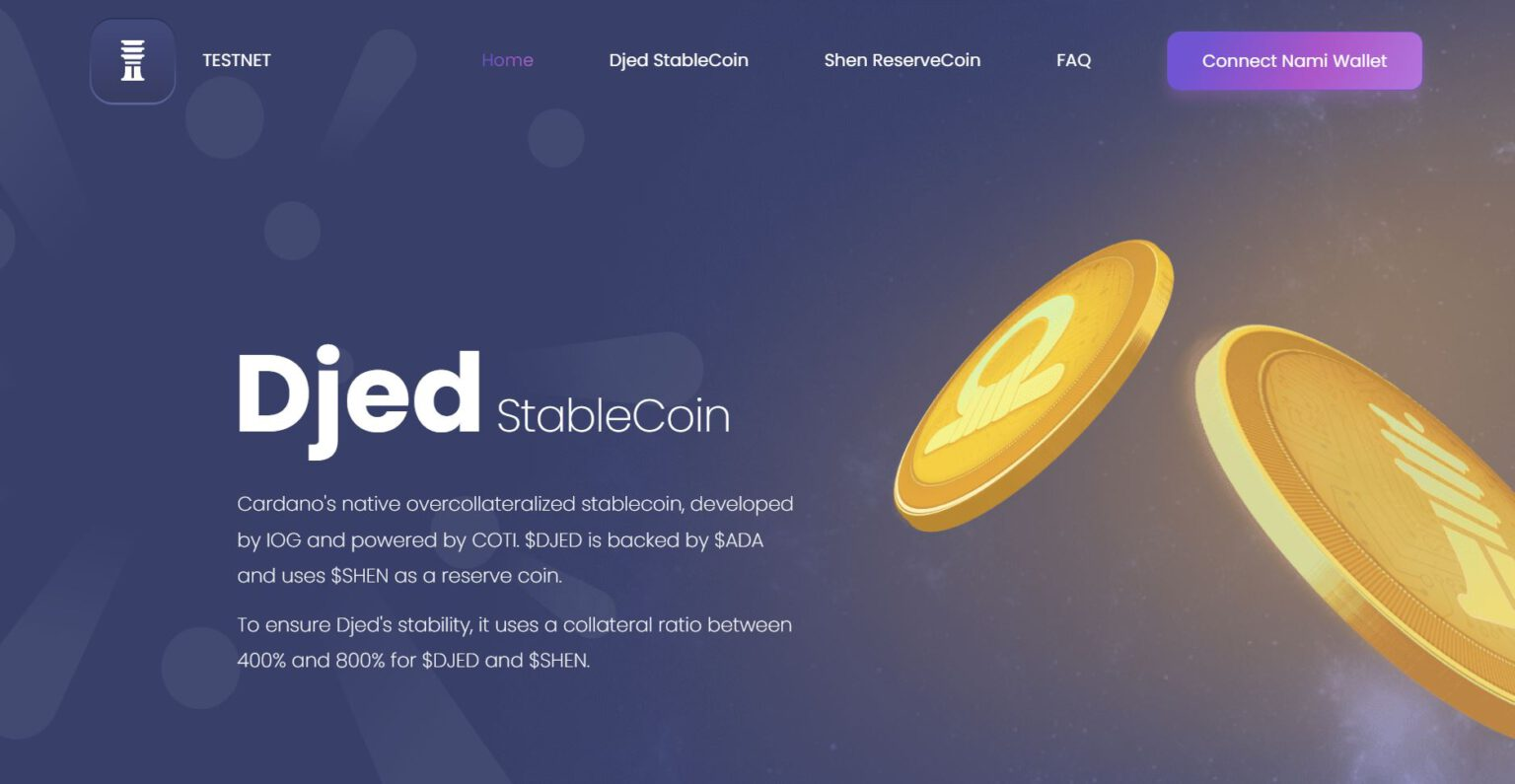 Djed (DJED) is an algorithmic stablecoin pegged to the USD, developed for Cardano in collaboration with IOG and the layer-1 blockchain platform COTI. DJED will be collateralized by ADA, requiring a minimum reserve ratio of 400% to mitigate the risk of losing its peg.