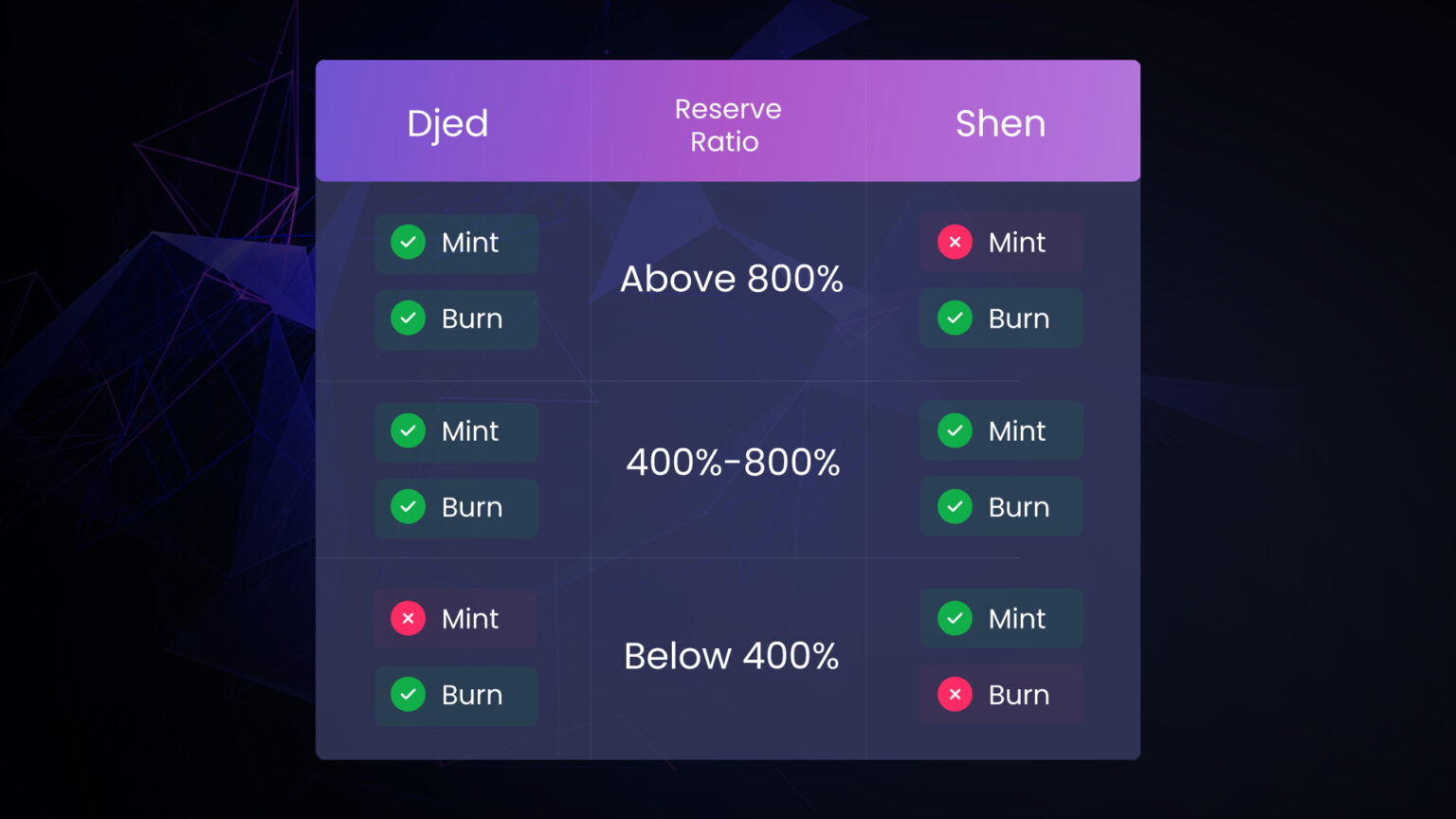 - Receiving all mint/burn fees for DJED and SHEN;