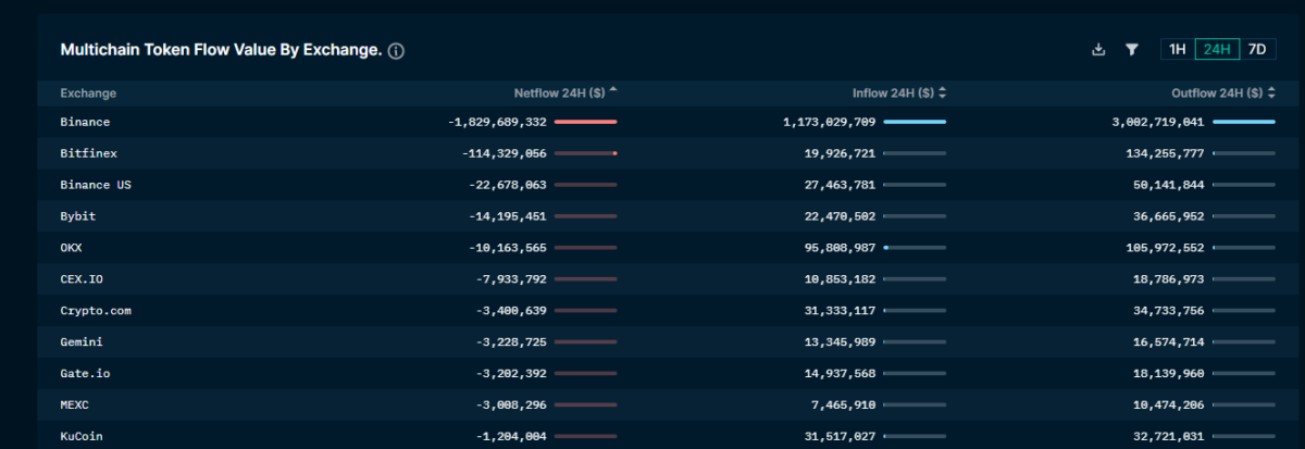 On-chain data reveals billions of dollars have fled exchanges across all chains in the past 24 hours. As Coin68 reported earlier, Binance alone saw up to $1.8 billion in outflows.