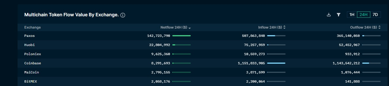 Nansen data shows that Paxos and Huobi have seen capital inflows, with around $162 million flowing back. Coinbase also recorded strong inflows, with about $124 million added to the exchange in the past 24 hours.