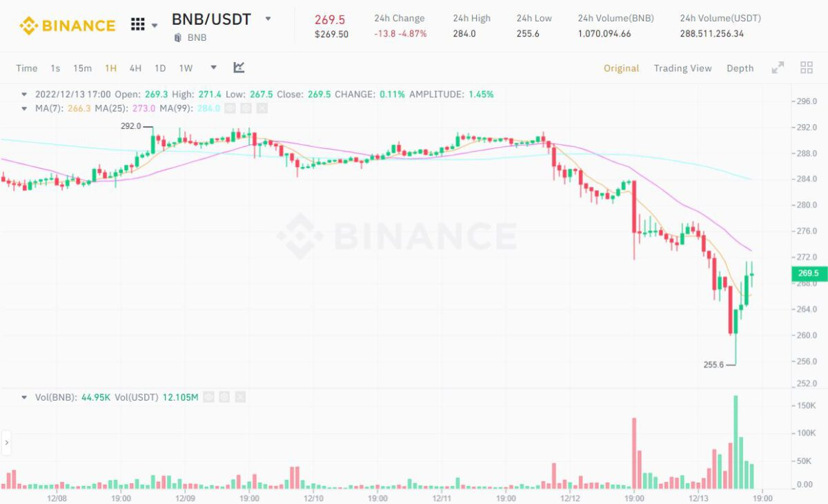 1H Chart of BNB/USDT on Binance as of 05:30 PM, December 13, 2022