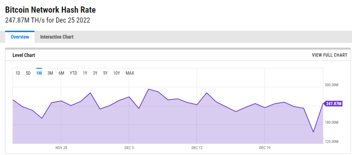 Bitcoin Hashrate Statistics as of December 26, 2022. Source: Ycharts