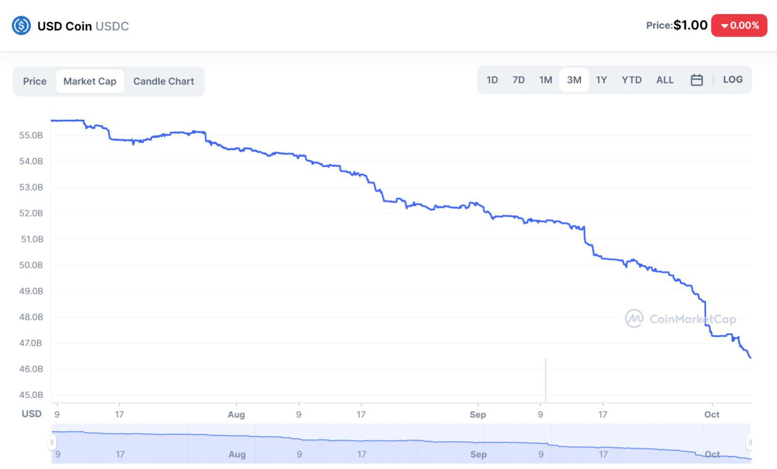 The total supply of the stablecoin USD Coin (USDC) has decreased from $55.55 billion to $46.57 billion over the past 90 days.