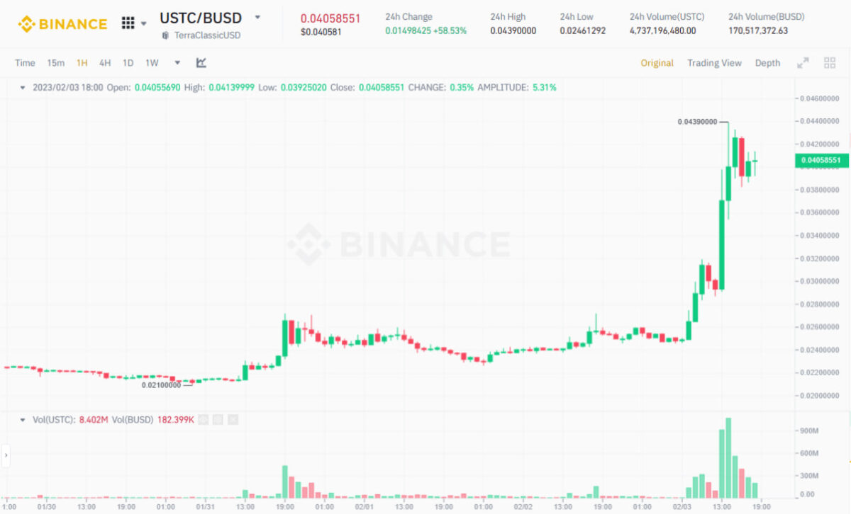 1H Chart of USTC/USDT on Binance at 06:55 PM, February 3, 2023
