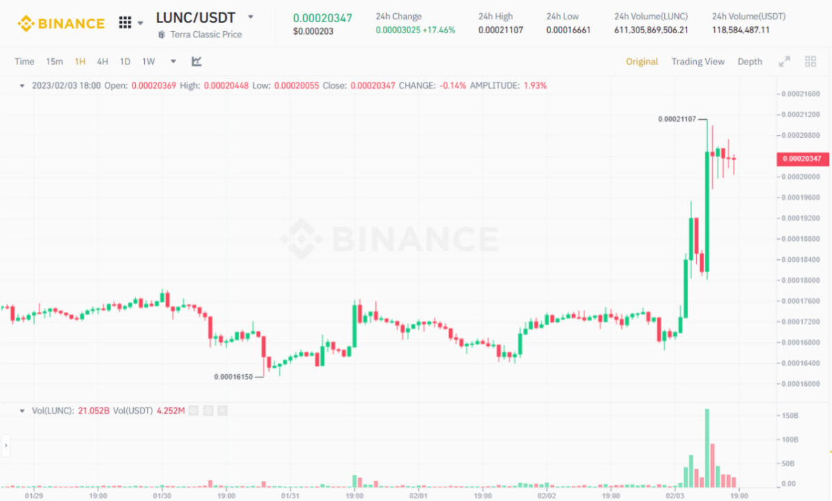 1H Chart of LUNC/USDT on Binance at 06:55 PM, February 3, 2023