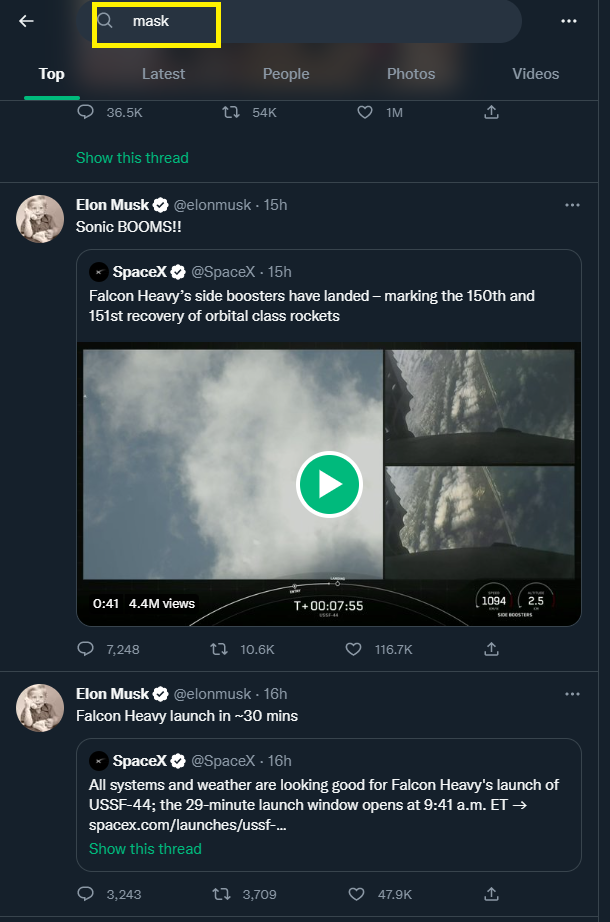When you search for "MASK" on Twitter, most of the results are related to Elon Musk. Twitter’s search algorithm seems to interpret "MASK" as a typo for "Musk," and it "helpfully" corrects the search!
