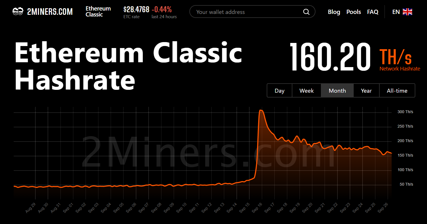 However, as of September 26, the overall hashrate of ETC has almost halved, dropping to 160.2 TH/s, a 46.16% decrease from the peak.