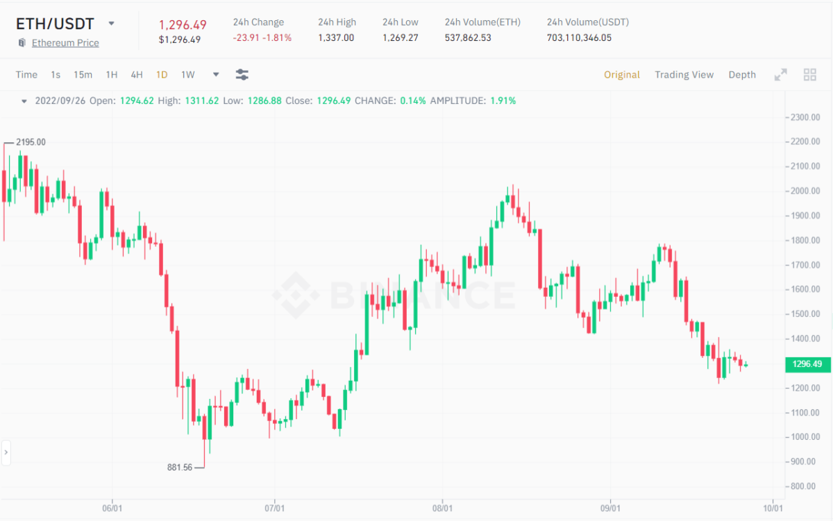 Even Ethereum itself has not escaped the downturn affecting the entire crypto market, despite the significant boost from The Merge. Ethereum has continuously dropped from around $1,600 to below $1,300.