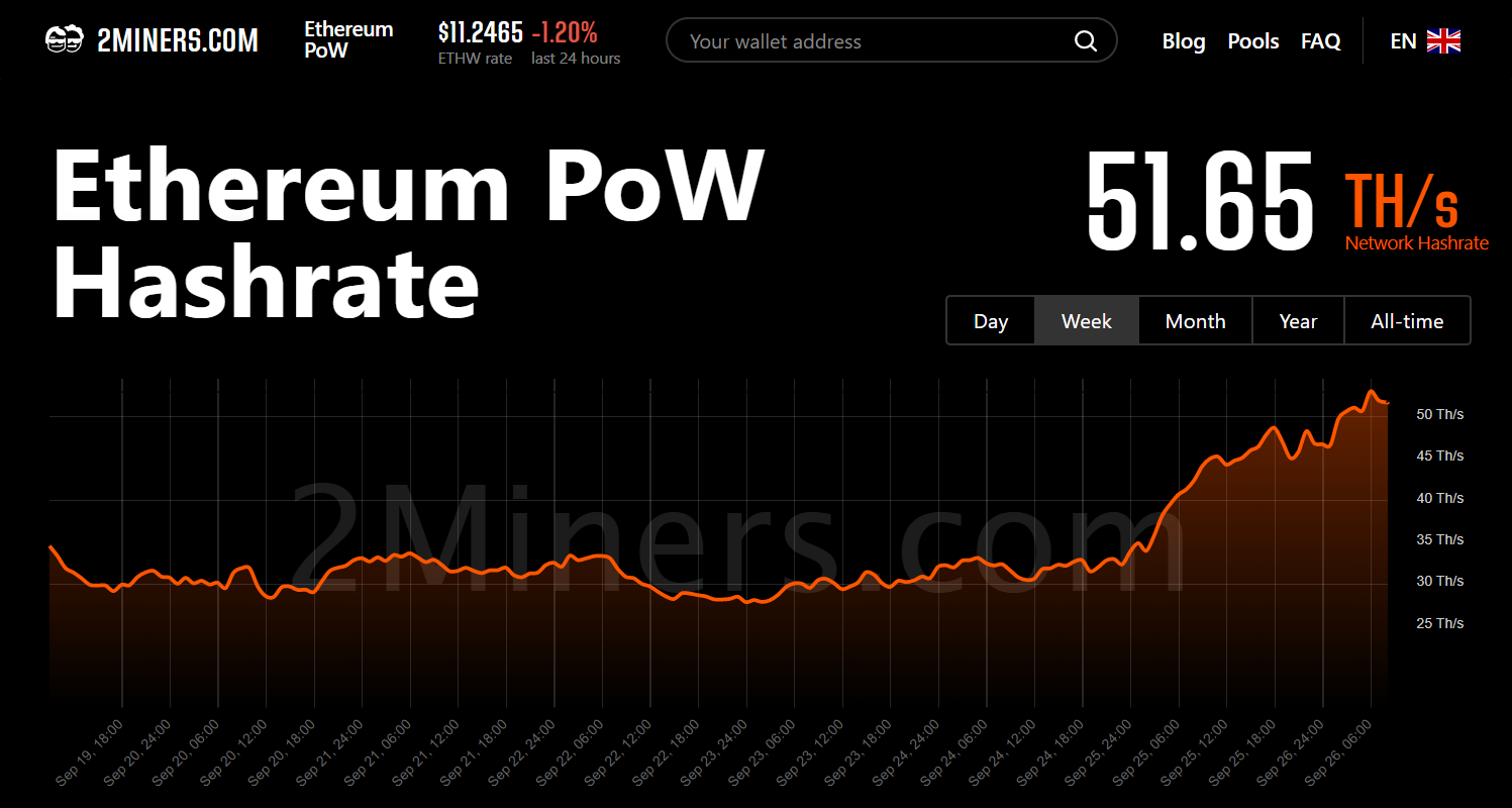 As a result, ETHW's hashrate has nearly doubled in the past week, climbing from a low of 28 TH/s to a peak of 51.65 TH/s at the time of writing.