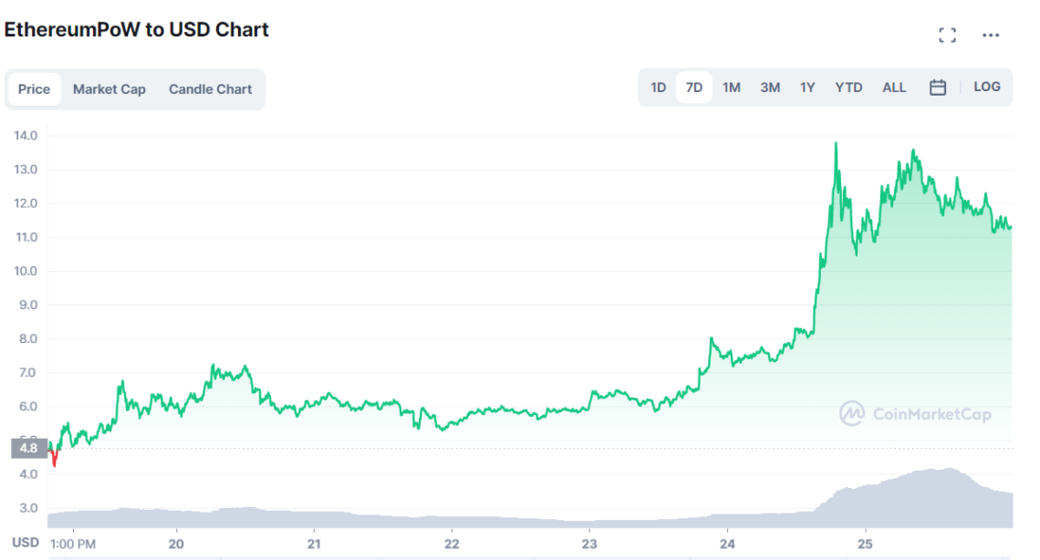 ETHW’s price has surged dramatically, increasing over 300% from around $4.8 to nearly $14, with the trend continuing upward.